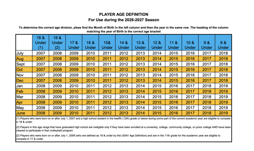 Age definitions are set by the USAV (governing body). Some athletes may qualify for two different age groups, depending on their DOB and grade